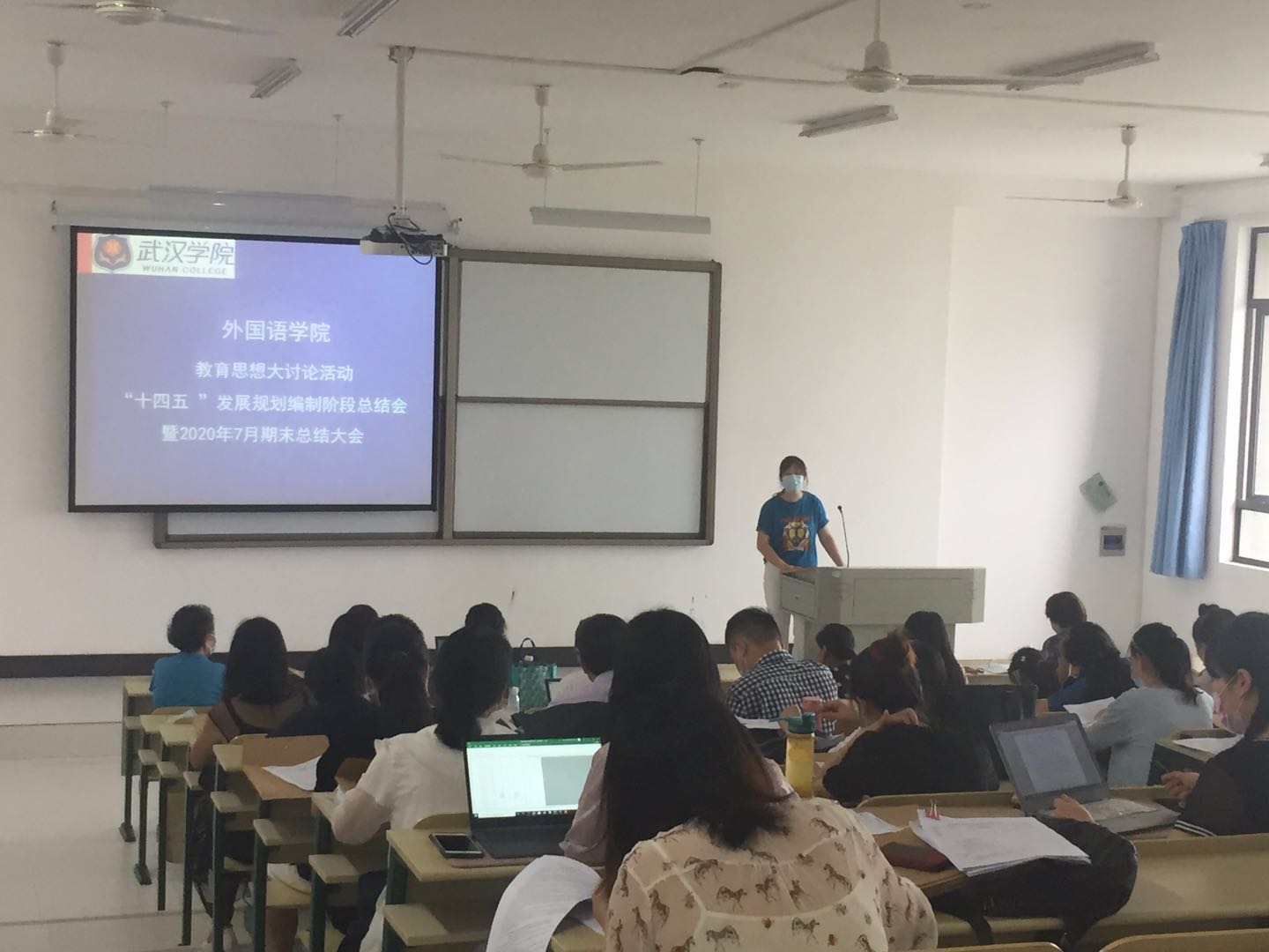 外国语学院院长曹曼做总结讲话。曹曼说,今年的疫情是史无前例的,每个人都应该重新审视疫情给我们带来的挑战和机遇。首先,曹曼对疫情期间克服困难保证线上教学,并从开始上课的迷茫到现在的镇定自若、游刃有余的青年教师们、对积极学习现代化信息技术的年纪较大的教授们、以及克服困难按时复工的行政辅导员老师们的工作再次予以肯定。特别对保障各项教学工作的顺利运行并取得良好成绩的系主任们、教研室主任们给予了表扬。而后,曹曼梳理了我院“十四五”规划指标体系,围绕学院办学规模、人才培养、师资队伍建设、学科专业建设、教育教学改革研究、实验室建设、实践教学等方面概述了未来五年目标,并结合7月8日校领导到我院调研提出的要求,曹曼对全院教师提出以下几点要求:一是外国语学院全体教职工要为学院的十四五发展凝心聚力;学院要加强文化建设,加强师德师风建设,老师们要恪守教师基本职业操守,为人师表,教书育人,为学院的发展共同努力;二是面对疫情,老师们要提前做好下学期教学准备,将线上线下混合式教学模式常态化,加强课程建设以及“一师一优课”建设;三是要围绕学校国际化办学定位,以及“十四五”规划要达到的英语通过率指标,计划开展研究生英语培训和雅思培训;四是要求每位老师申报课题,通过填写课题申报书的过程,思考和理顺研究思路;五是重视实践教学,充分利用实验实训室展开对教学、科研、创新创业项目指导等各类研究、学习实践,并加强实习实训基地建设,加大学生集中实习的力度;六是各项工作要按照本科合格评估要求的规范性进行,尤其要加大论文和试卷规范性要求,要以一个评估者的视角去审视和评价各项教学工作。