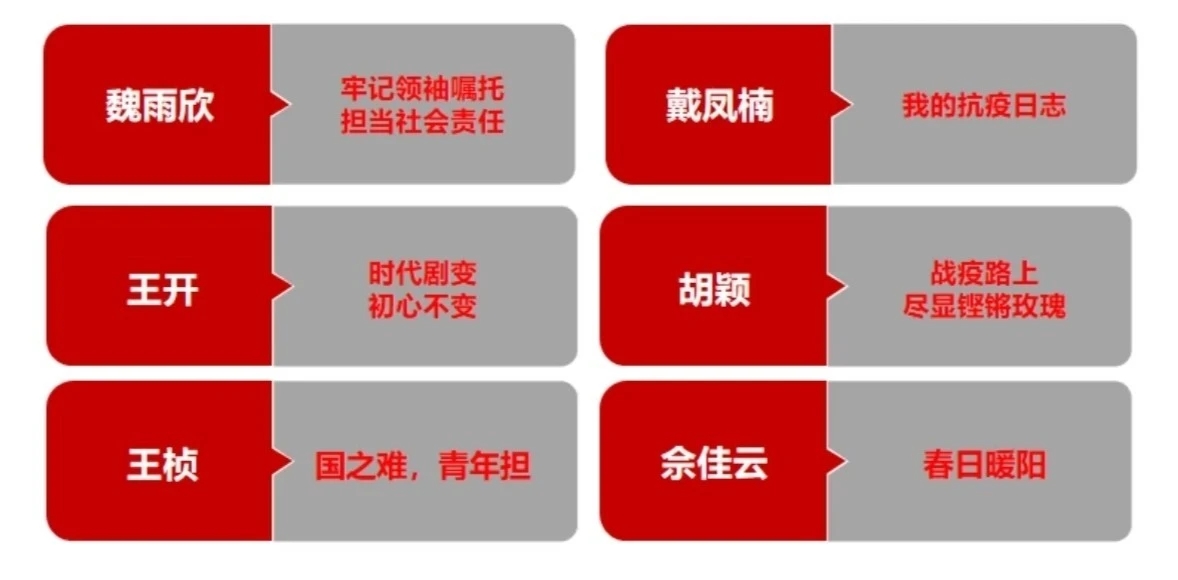 参加抗疫志愿者工作的优秀老师和学生代表分别分享了他们的战疫故事。疫情期间,管理学院党员师生秉持着全心全意为人民服务的宗旨,化身抗疫先锋,冲在前线。魏雨欣得知镇卫生院因定点收治确诊和疑似病人执行全封闭管理,生活供应困难,她在乡间组织收购了100斤鸡蛋,克服重重困难亲自送到医护人员手中;戴凤楠和王桢返乡后得知武汉疫情严重的信息,先是主动自觉在家对自己执行严格自我隔离观察,安全度过后,又主动请缨到防疫前线执勤,参加志愿服务。她们不在意所经历的辛苦与疲惫,志愿服务带给她们的有激情,感动和责任;王开作为团支部书记,在疫情之初组织支部的团员干部为抗疫捐款,并组织防疫物资捐赠给武汉周边卫生医疗基础薄弱的城镇卫生院;佘佳云、范鹏飞等同学联合华中师范大学、文华学院等多所高校的大学生创立“暖阳计划”,为在抗疫一线的白衣天使解决后顾之忧,免费辅导他们正在上小学和初中的孩子进行学习,守护他们的后方家园;胡颖老师每天除了完成学校的防疫工作要求,还积极参加社区工作,照顾社区内留守的老人,统计好每一家每一户所需要的物资,代买,分发,高峰的时候每天忙碌到深夜,依然心怀热情,面有微笑,用积极乐观的态度感染身边的同伴。