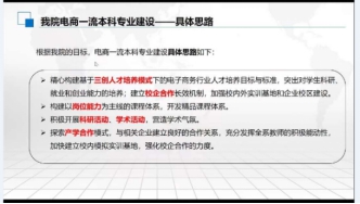 华中师范大学信息管理学院电子商务专业建设中的学科建设、课程建设、教学成果、科研成果、师资力量、平台与基地建设、社会服务等方面做了详细解析,提出电子商务一流本科专业建设的具体思路、发展规划、基本要求、重点建设内容预算、学校对专业建设的支持及存在的困难。
