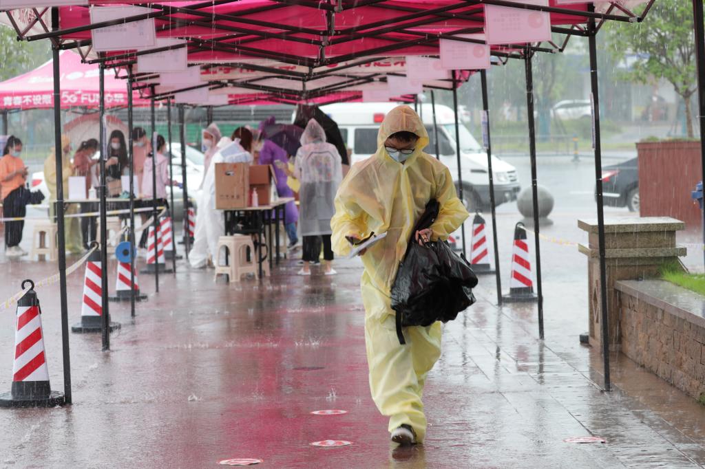 上午排队入校时突然下起大雨,部分学生没带雨伞,后勤保障处调来多余的防护服,分发给学生遮雨。