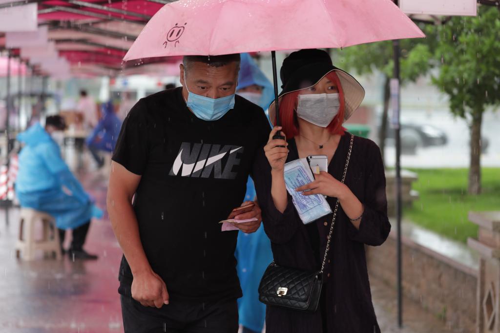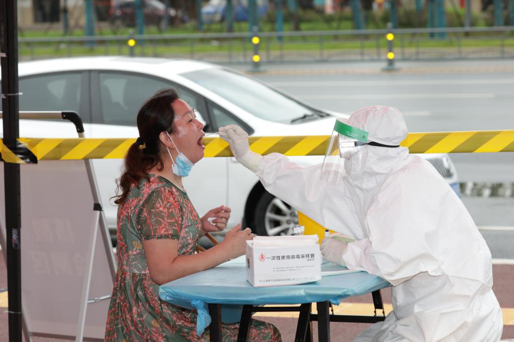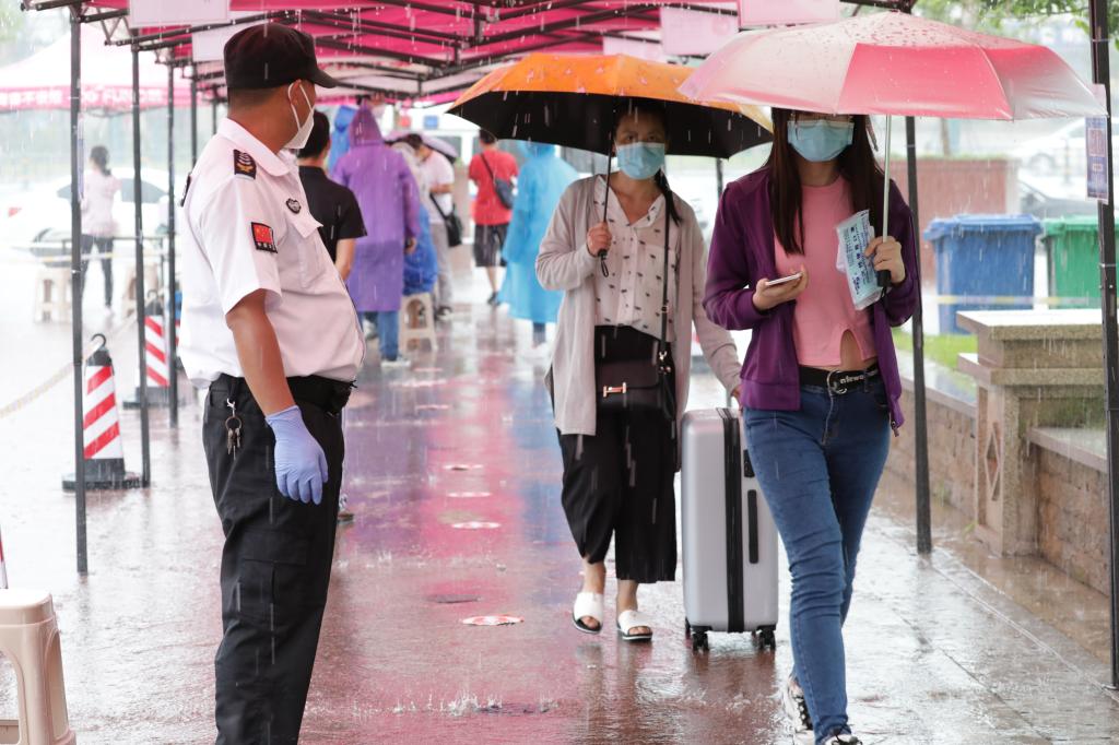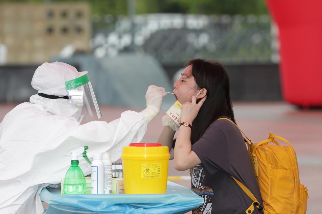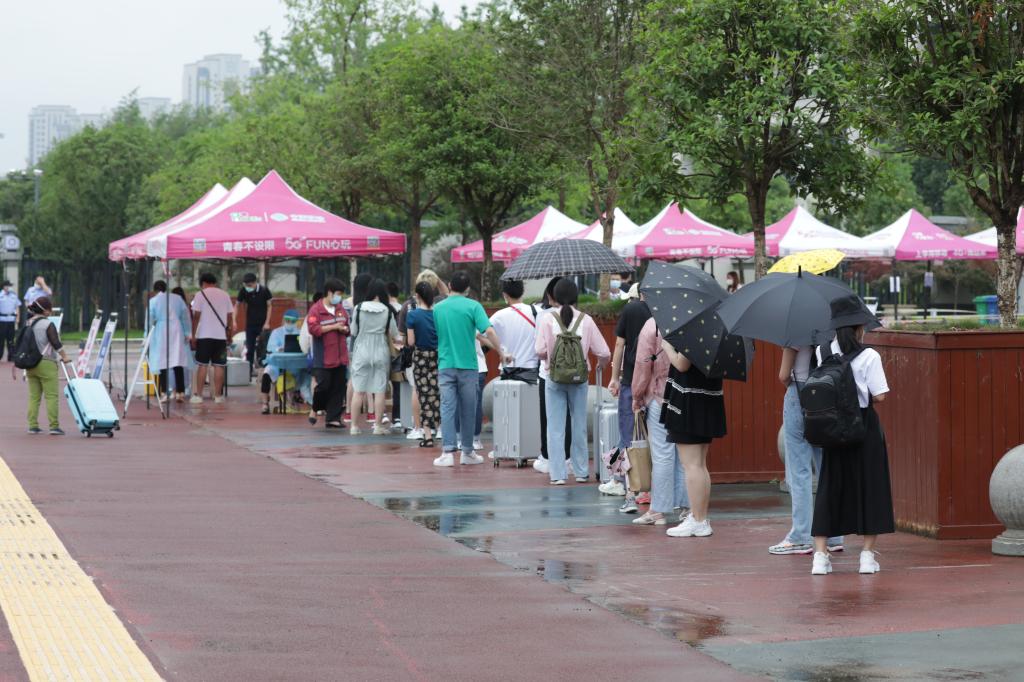 行人入口设有核酸检测区,未做检测的学生和家长在这里接受核酸检测。