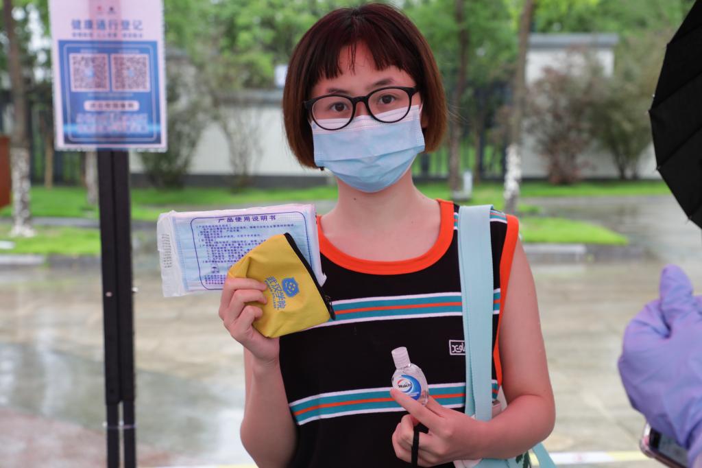每人一份“返校爱心包”,内含口罩一包、消毒液一瓶、餐票三张;