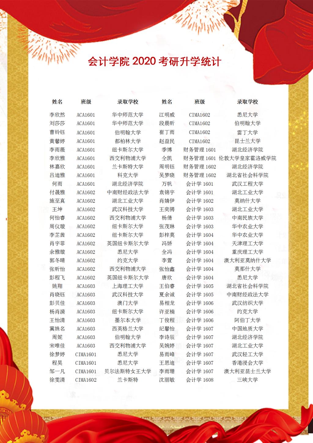 随着2020年研究生复试接近尾声,我校会计学院今年考研成绩再传捷讯。据悉,今年会计学院参加考研人数为163人,截止6月10日共录取64人(拟录取27人、境外深造37人),录取人数占报考人数39.26%,占本科毕业生人数10.67%。其中8人考取国内双一流高校、32人考取境外2020QS世界大学排名前500高校。录取学校有华中农业大学、华中师范大学、中国地质大学、中南财经政法大学、中南民族大学、墨尔本大学、悉尼大学、昆士兰大学、莫纳什大学、伯明翰大学、兰卡斯特大学、英国纽卡斯尔大学、约克大学等境内外高校。