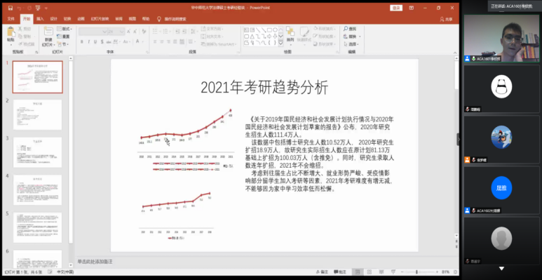 三位分享人从明确目标、院校选择、复习方法等方面进行经经验交流。李欣然跨专业考取华中师范大学法学专业,他着重分析了2021年的考研趋势,在考研人数逐年增长的同时,考虑到往届生占比不断增大、就业形势严峻、受疫情影响部分留学生加入考研等因素,2021年考研难度有增无减,不可因家中学习效率低而松懈。同样跨专业被华中师范大学翻译专业录取的刘莎莎分享了自己整个考研的心路历程,从“透彻了解报考学校,严格完成每日复习计划”的角度出发,建议考生从研招网或者学长学姐的经验贴中获取需要的信息。被中南财经政法大学审计专业录取的付晟雅在分享经验的同时,也为考生们提供了一些与考研资讯、考研试题相关的微信公众号和考研界的名师人选,同时告诉同学们保持平和、乐观心态的重要性。分享结束后,现场同学与主讲人就考研与实习的选择、备考计划制定、复习方法等方面的内容进行了深入的互动交流。