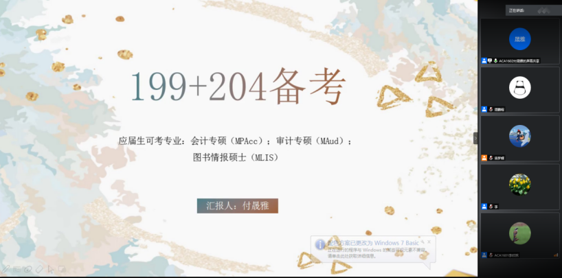 分享考研心得传承优良学风。为了进一步提高学生的考研热情,明确考研目标,掌握考研技巧,6月8日晚,会计学院“我的考研之路”考研经验分享会线上举行。ACA1601班李欣然、刘莎莎、ACA1602班付晟雅等3名同学应邀与17级正在备战考研的同学进行了经验分享与互动交流。会议由辅导员袁梦蝶主持。会计学院副院长王桂红、国际会计教育中心主任李凌教授、院综合办公室周鹏程、辅导员舒晗、叶珲以及17级备战考研的学生代表参加了会议。