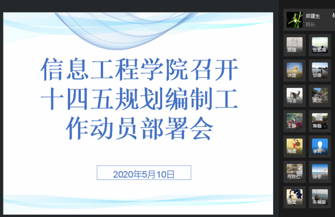 为深化教学改革,推动学校学院事业又快又好发展。5月10日14点,信息工程学院线上组织开展了“十四五”规划部署大会。院领导班子、各系主任、专业委员会主任和院办公室成员参加了此次会议。会议由郑建生院长主持。