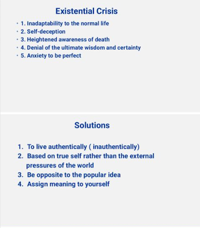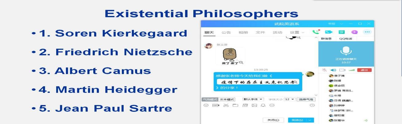 接着,张老师着重介绍了法国哲学家萨特(1905-1980)的5个主要思想:存在先于本质,存在主义是一种人道主义,人是自己行为的总和,人有自由却无法逃避选择的自由(不做出选择本身也是一种选择),人需要不断超越和突破才能成为自我。在现实疫情的影响下,人们除了生活习惯和方式被迫发生了改变之外,心灵感受到死亡如影相随,从未离得如此之近,而由此引发了对生命和生活的反思。在现实生活普遍体现的“存在感危机”中,张老师归纳了5点,并着重强调存在主义哲学思想中提倡的是 “拥抱不确定性”,人生没有“终极的智慧”,由此也不必奢望人生的完美和一帆风顺。