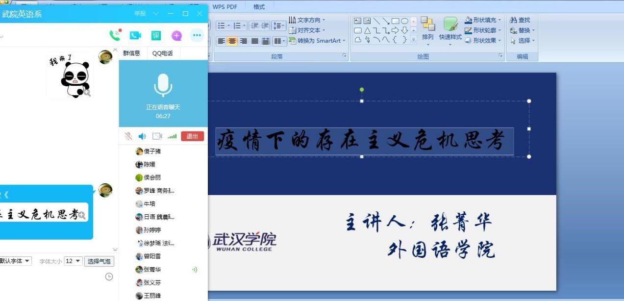 近日,外国语学院举办了本学期第6期在线科研工作坊活动。本期主讲教师为张菁华副教授,她分享的主题为“疫情下的存在主义危机思考”,英语系的全体教师参加了此次活动。本期工作坊由英语系教师周松老师主持。