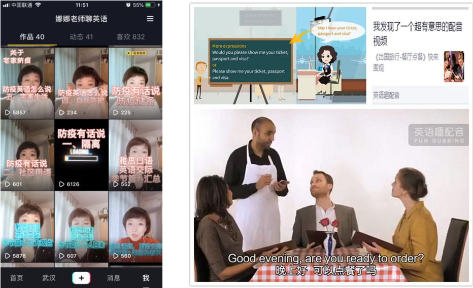 自制小视频,提高线上学习效果 。担任基础英语(2)课程的张密老师课前会给学生提供电子教材和学习音视频资源,提前录制好视频课程等,以便学生预习和复习,促进学生自主学习习惯的养成;李娜老师在给学生上雅思课程时,特意制作了”防疫有话说“专辑小视频,作为课堂内容的补充,分别介绍了“隔离词汇”、“社区防疫用语”、“居家防疫准备”“宅家防疫”等与防疫相关词汇的介绍和表达,深受学生的喜爱;商务英语2课程团队李莞婷和夏胜武教师巧用“趣配音软件”,抓住学生的耳和心,在分享中充分调动了学生的参与。
