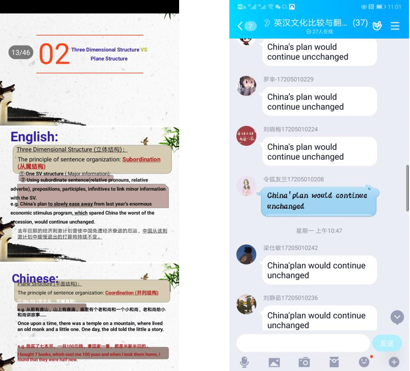 慕课堂+QQ直播, 提高学生参与度。外国语学院的阮广红、鲁萌等老师,使用了慕课堂+QQ直播的教学模式。QQ群用来开展直播授课、作业发表和批改等活动,慕课堂主要用于发送预习内容和教学视频,满足学生个性化学习的需求,同时慕课堂的签到、讨论、问卷、练习功能可以有效记录学生考勤、课堂讨论活跃度、学情反馈情况。两个平台各有所长,效能互补,既有效地督促了学生紧跟教学进度,也能够帮助老师实时掌握学生的学习情况。
