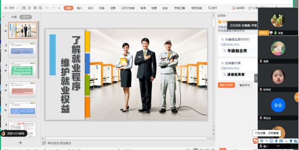 受疫情影响,2020届毕业生求职的主阵地从“线下”转为“线上”。毕业人数众多、企业招聘受扰、云招聘这一新鲜事物带来的挑战等,让今年的高校就业压力增大。就业是最大的民生,为帮助毕业生们认清当前形势,让毕业生顺势而为,主动出击,牢牢把握就业机会,外国语学院于2020年5月5日晚19:00,通过腾讯会议开展“了解就业程序,维护就业权益”主题分享会,分享会由外国语学院毕业班辅导员李莹老师主讲,外国语学院2016级毕业班学生参加。