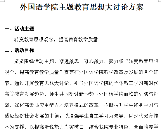 外国语学院本次主题教育思想大讨论动员会,吹响了主题教育学习活动的号角,使全院教师进一步明确了主题教育学习活动的使命,统一了思想,认准了目标,外国学院全体师生将把主题教育思想大讨论各项学习活动落实到实处,为培养适应经济和社会发展需要的高素质应用型人才而努力。