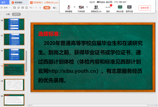 为深入学习贯彻习近平新时代中国特色社会主义思想,认真贯彻落实中央领导同志对西部计划的批示指示精神,进一步引导和鼓励2020届毕业生到基层工作,进一步在青年中弘扬“奉献、友爱、互助、进步”的志愿精神,外国语学院于4月17日19:00通过腾讯会议平台开展线上动员会,引导和动员更多毕业生服务西部,奉献自我。本次动员会由外国语学院毕业班辅导员李莹老师主持,外国语学院2020届毕业班学生参加,动员会特别邀请了2019年西部计划志愿者商务英语1502班学长龙滨做分享,外国语学院党总支副书记、副院长曹辉出席本次动员会。