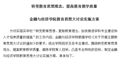 据悉,《金融与经济学院教育思想大讨论实施方案》是在学校工作部署的基础之上,结合金融与经济学院的工作实际,经过主题教育思想大讨论活动小组多次讨论最终定稿。