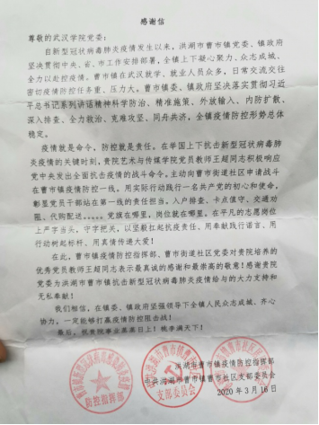近日武汉学院艺术与传媒学院党总支收到了一份“沉甸甸”的感谢信。一封盖有防控指挥部、支部委员会、社区委员会三个大红印章的感谢信里,对武汉学院党委及组织培养出的优秀党员王超同志均表示了深深的谢意。